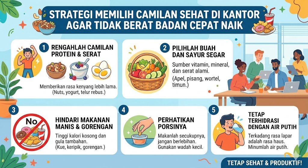 Bekerja di depan layar dalam waktu lama sering kali memicu keinginan untuk mengunyah, baik karena rasa lapar asli maupun sekadar pelarian dari stres pekerjaan. Kebiasaan “ngemil” yang tidak terkontrol di kantor merupakan salah satu faktor utama yang menyebabkan jarum timbangan terus bergeser ke kanan. Tanpa disadari, kalori dari biskuit manis, gorengan, atau minuman kekinian bisa melebihi kalori makan siang Anda. Oleh karena itu, menerapkan strategi yang cerdas dalam memilih asupan antara waktu makan sangat penting untuk menjaga kebugaran dan berat badan ideal.
