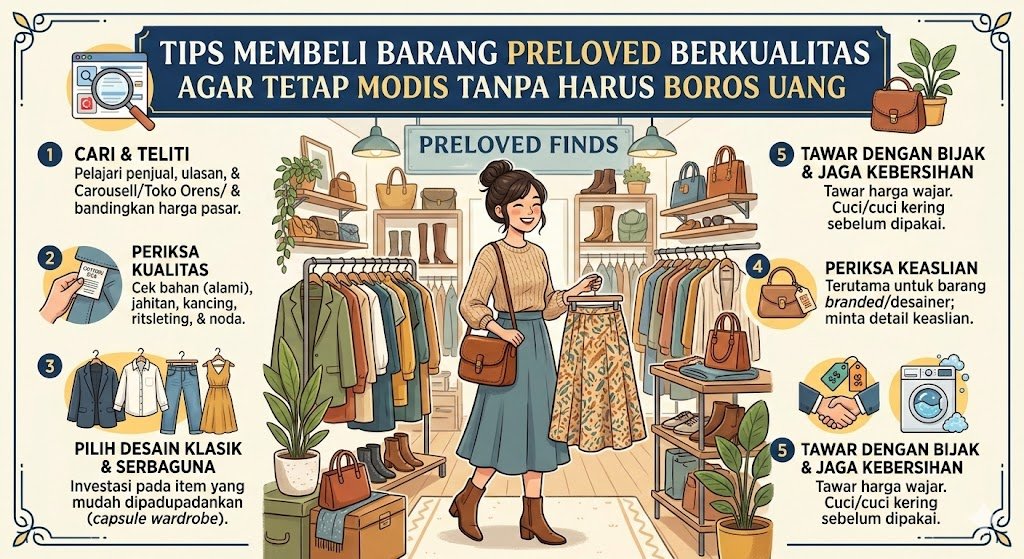 Tren fashion berkelanjutan kini semakin diminati, salah satunya melalui budaya belanja barang preloved atau barang bekas pakai. Selain membantu mengurangi limbah tekstil, berburu barang preloved adalah strategi jitu untuk tetap tampil modis dengan anggaran terbatas. Namun, agar tidak menyesal di kemudian hari, diperlukan ketelitian ekstra dalam memilih item yang masih layak pakai dan memiliki nilai estetika tinggi.