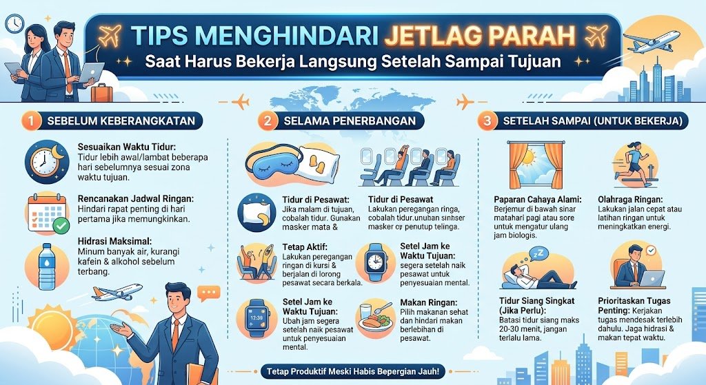 Perjalanan lintas zona waktu sering kali menjadi tantangan besar bagi para profesional yang memiliki jadwal padat. Fenomena jetlag bukan sekadar rasa kantuk biasa, melainkan gangguan ritme sirkadian tubuh yang dapat menurunkan fokus dan produktivitas secara drastis. Jika Anda dituntut untuk langsung menghadiri rapat atau menyelesaikan pekerjaan sesaat setelah mendarat, persiapan yang matang adalah kunci utama agar performa tetap prima.